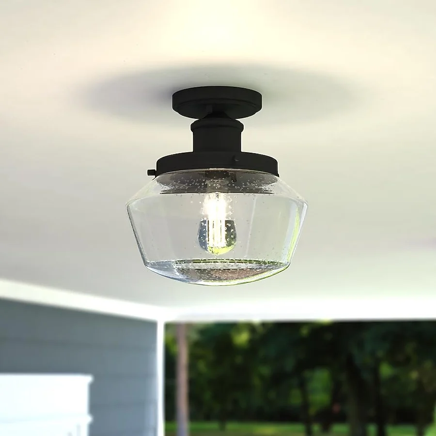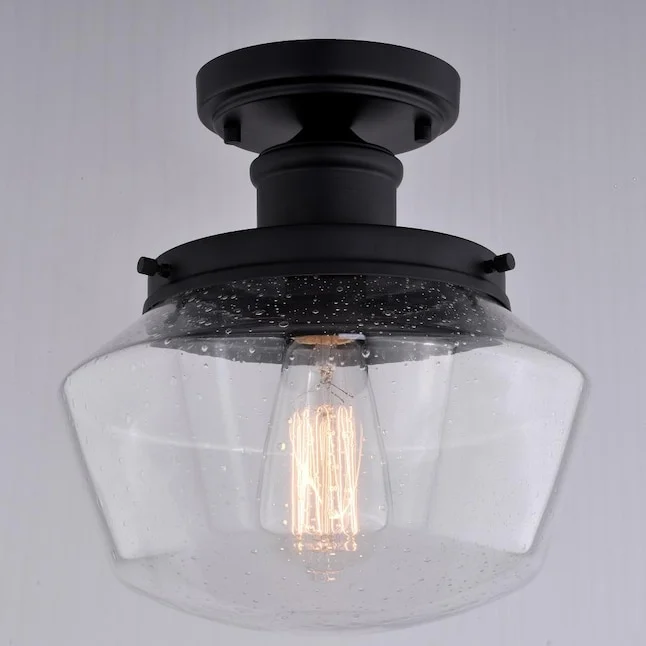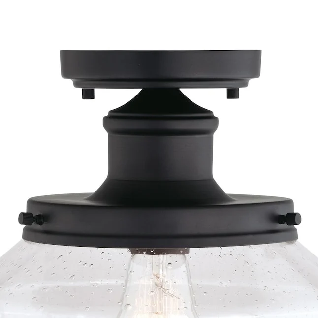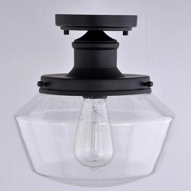 modern schoolhouse design. Featuring a clear seeded glass shade paired with a sleek matte black finish, this fixture