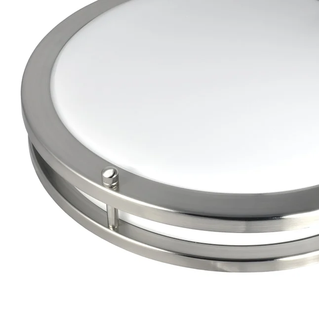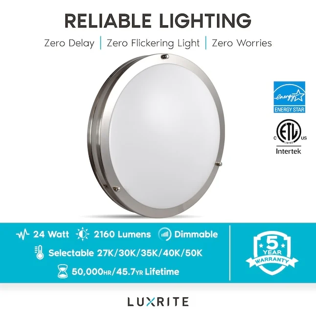 The Luxrite 1-Light 4.45-in Brushed Chrome Flush Mount Light delivers both modern design and flexible lighting options. Designed with a built-in 5-color temperature switch, this fixture allows you to select your ideal ambiance with ease — from warm white to bright daylight — ensuring the perfect lighting for any space in your home or business.