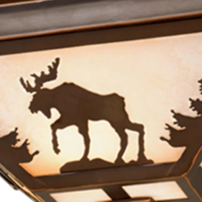 Designed with rustic flair, this fixture showcases beautifully detailed silhouettes of moose and pine trees against a warm, white Tiffany-style glass shade.